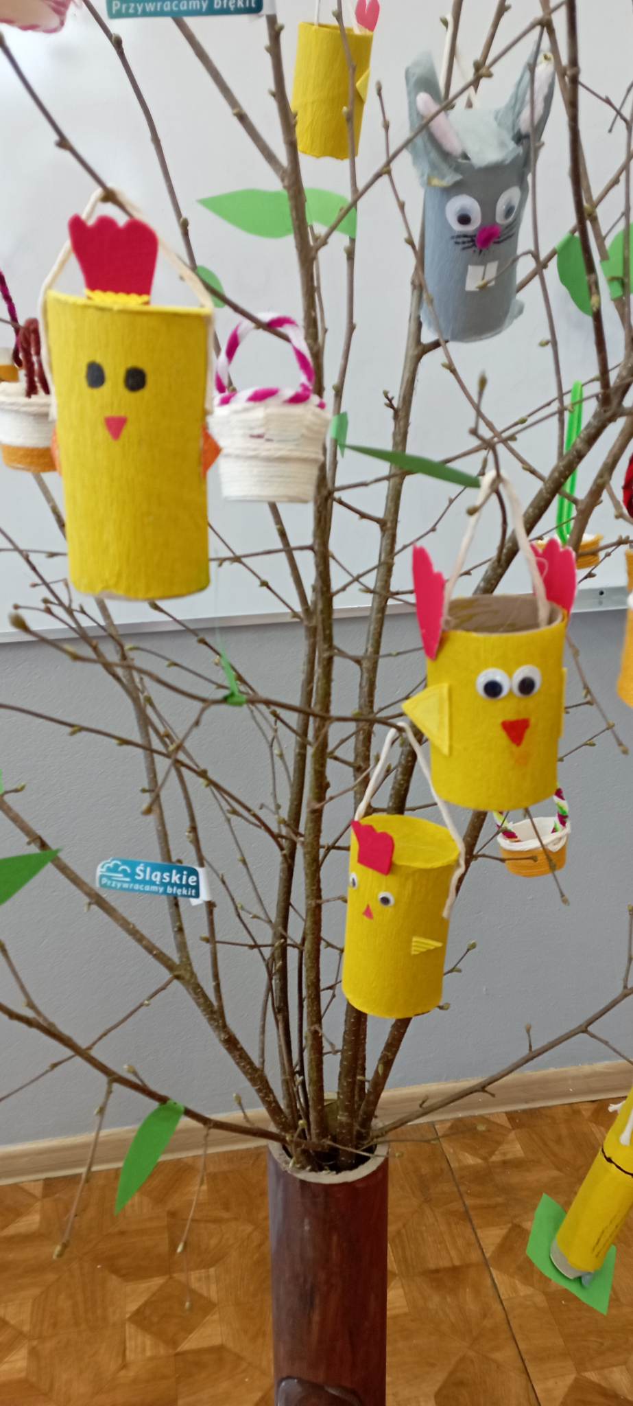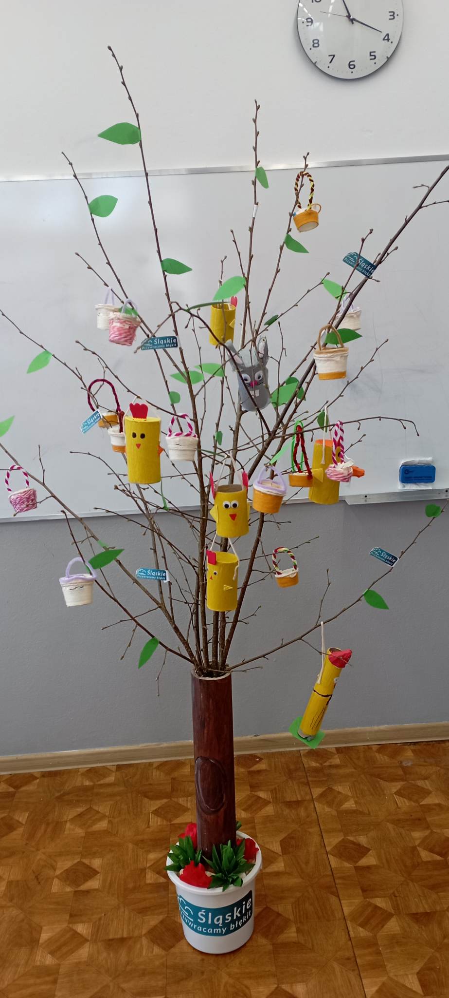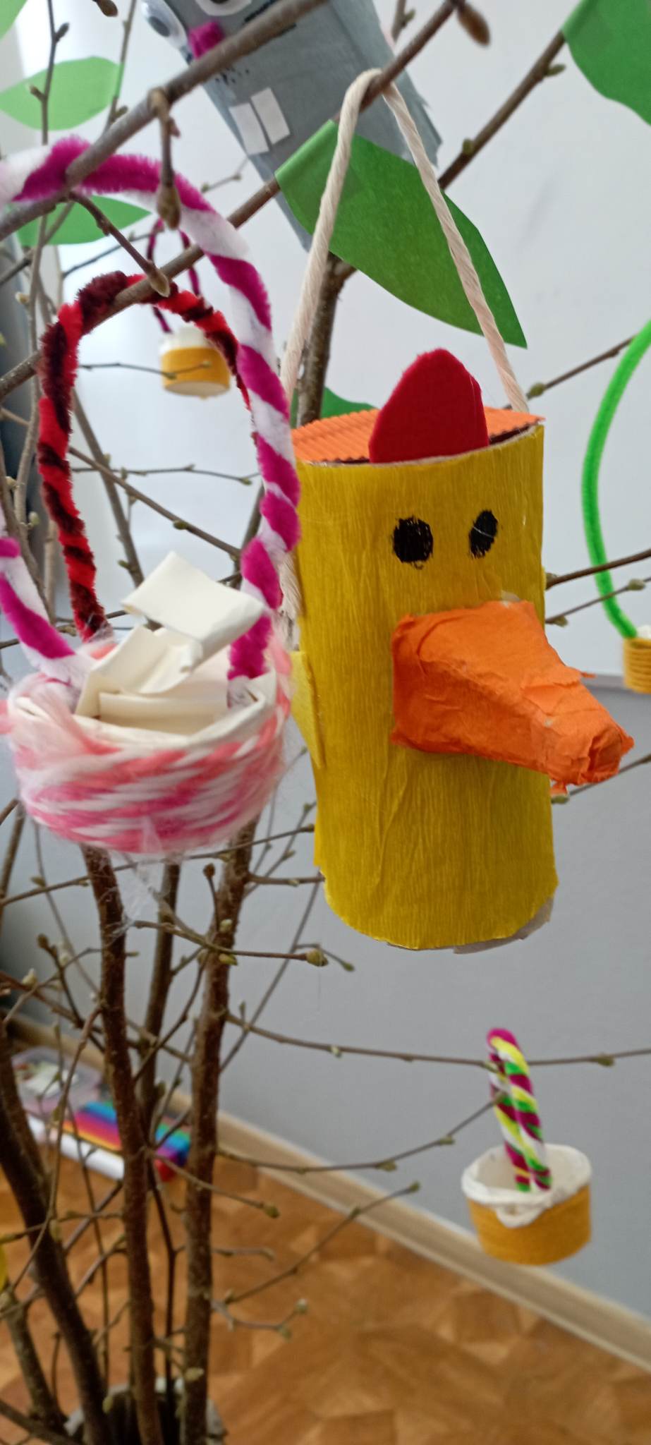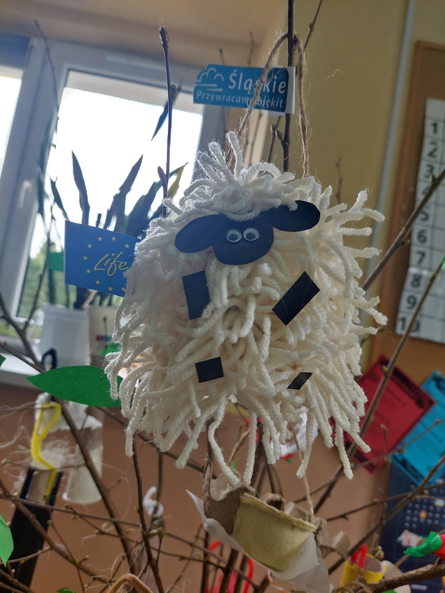 At the beginning of April, the Eco-Advisor conducted educational and creative workshops titled "Eco Easter Decoration" at the Primary School in Podlesie and the Primary School in Ślęzany. The workshops were held in the spirit of DIY (do-it-yourself). Students decorated spring trees with baskets, chicks, lambs, and rabbits made from paper rolls and paper cups.
