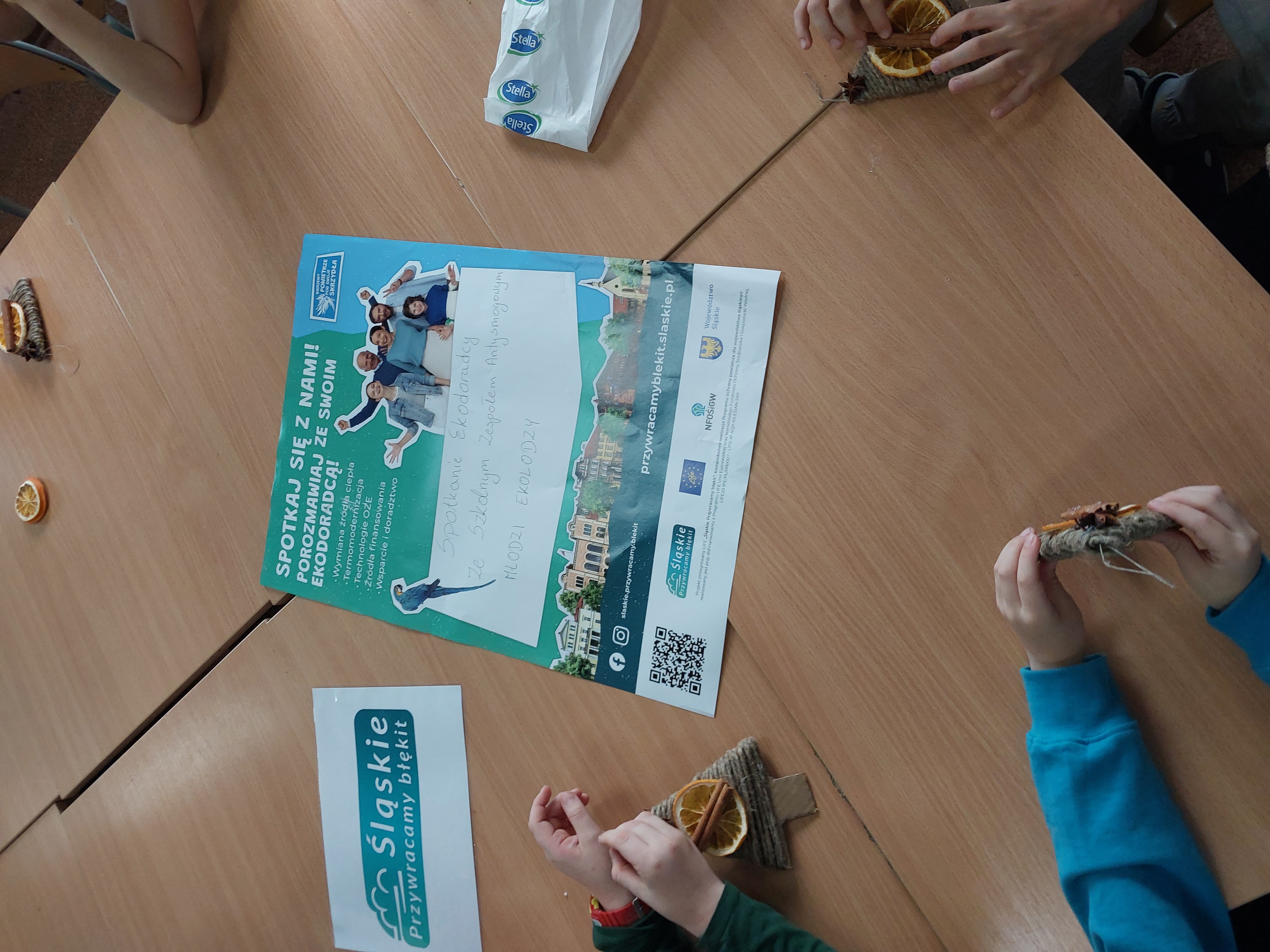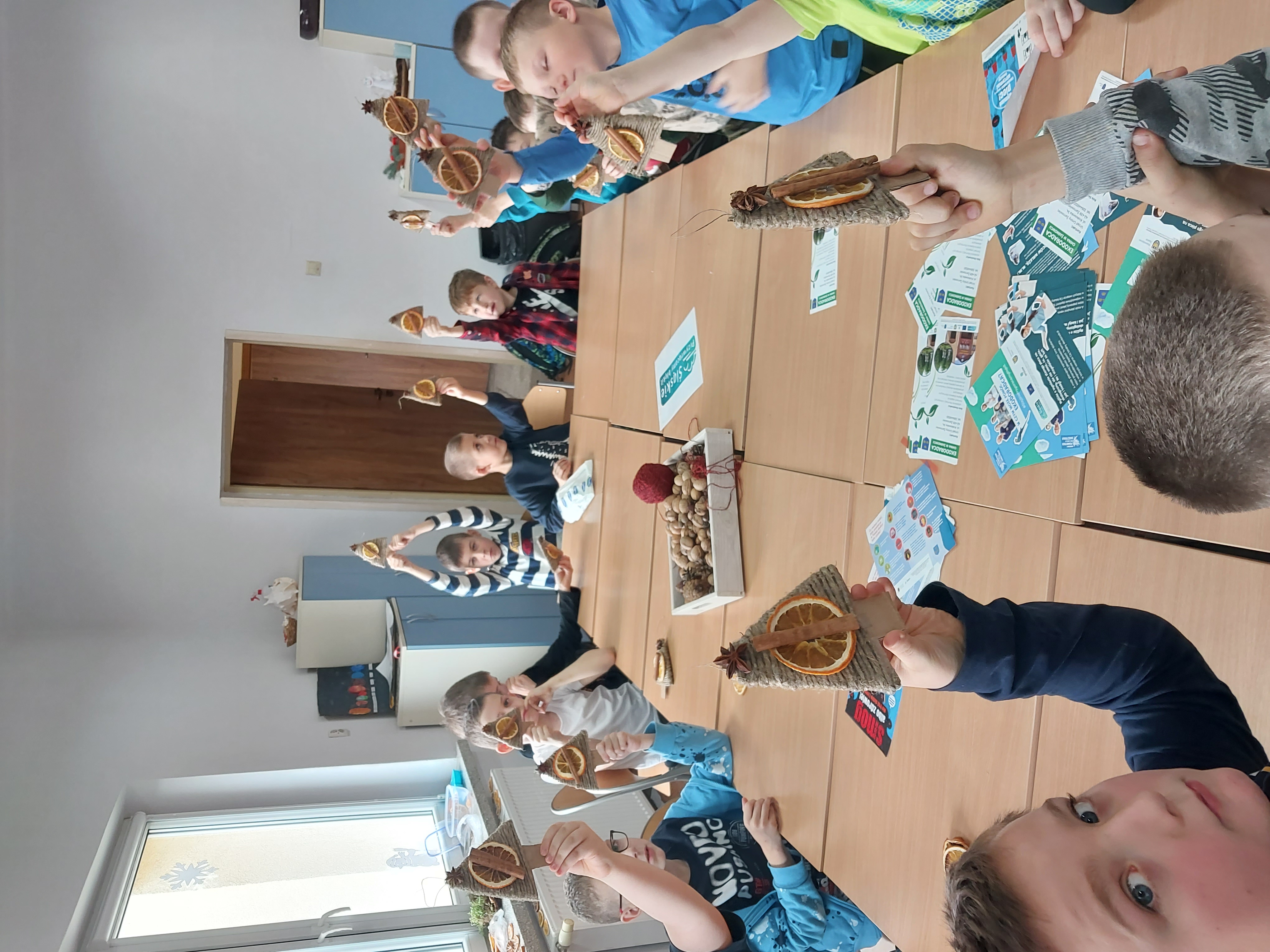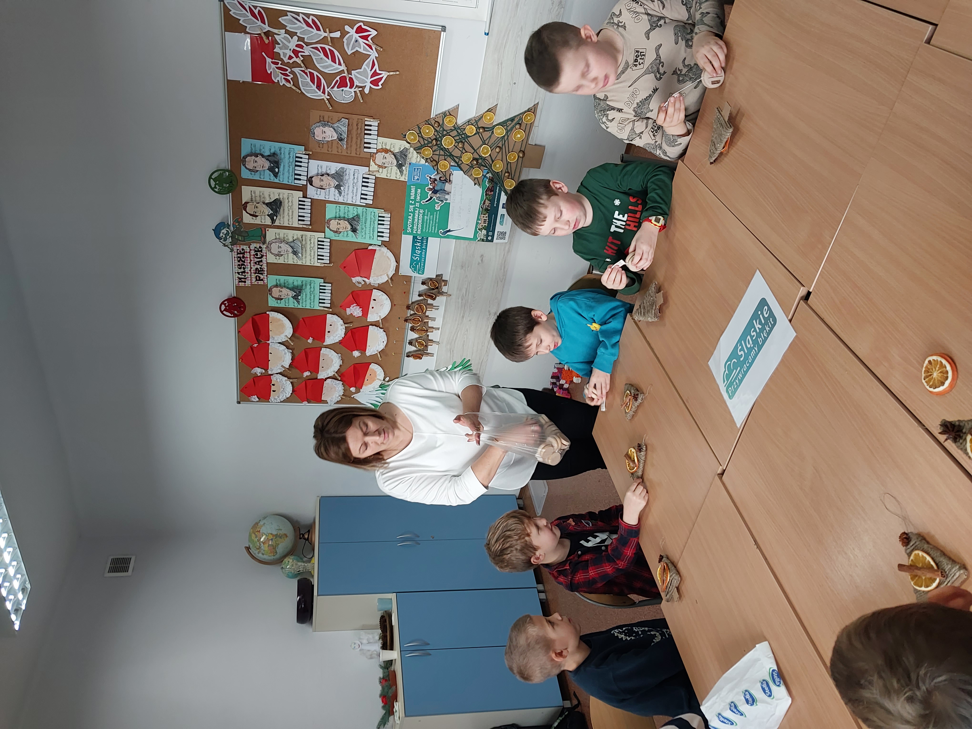 On December 15, 2023, a meeting took place with the School Anti-Smog Team "Young Ecologists" and Iwona Gębka, the eco-manager of the Żarnowiec Municipality. The children familiarized themselves with the LIFE project "Silesia. Blue Sky Restored," its goals, and scope of operation. It also served as the basis for discussions and organizing actions to create ecological Christmas decorations.