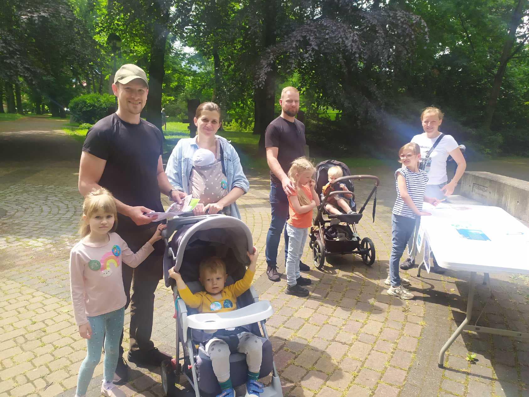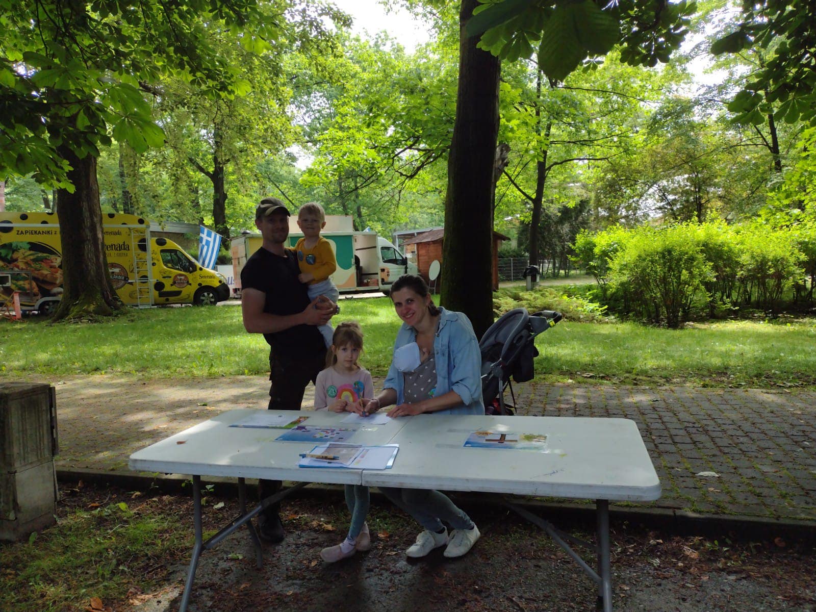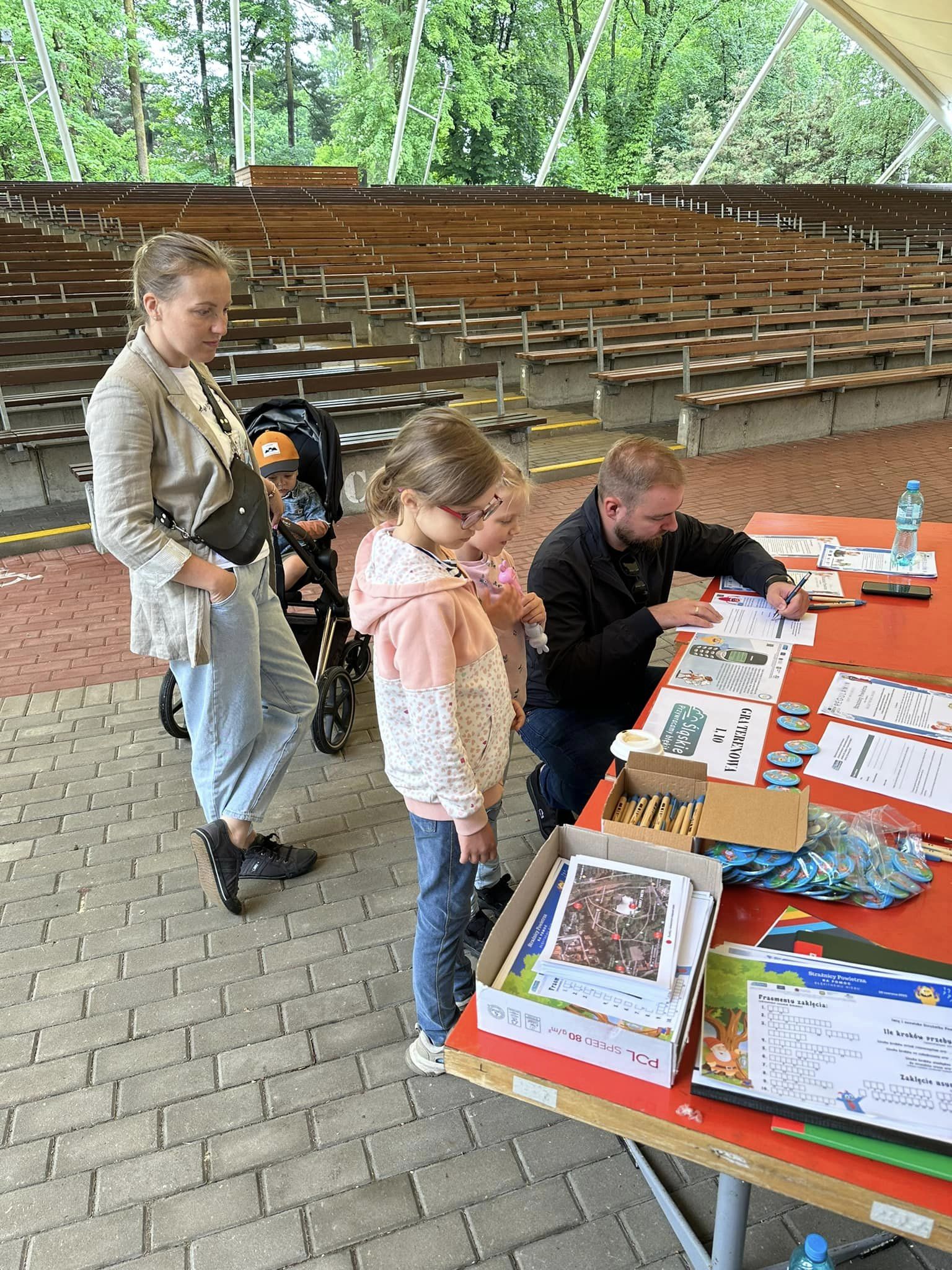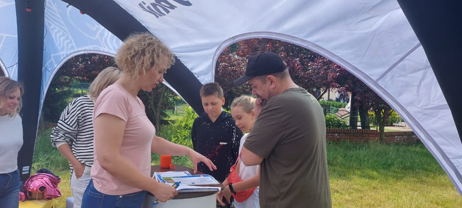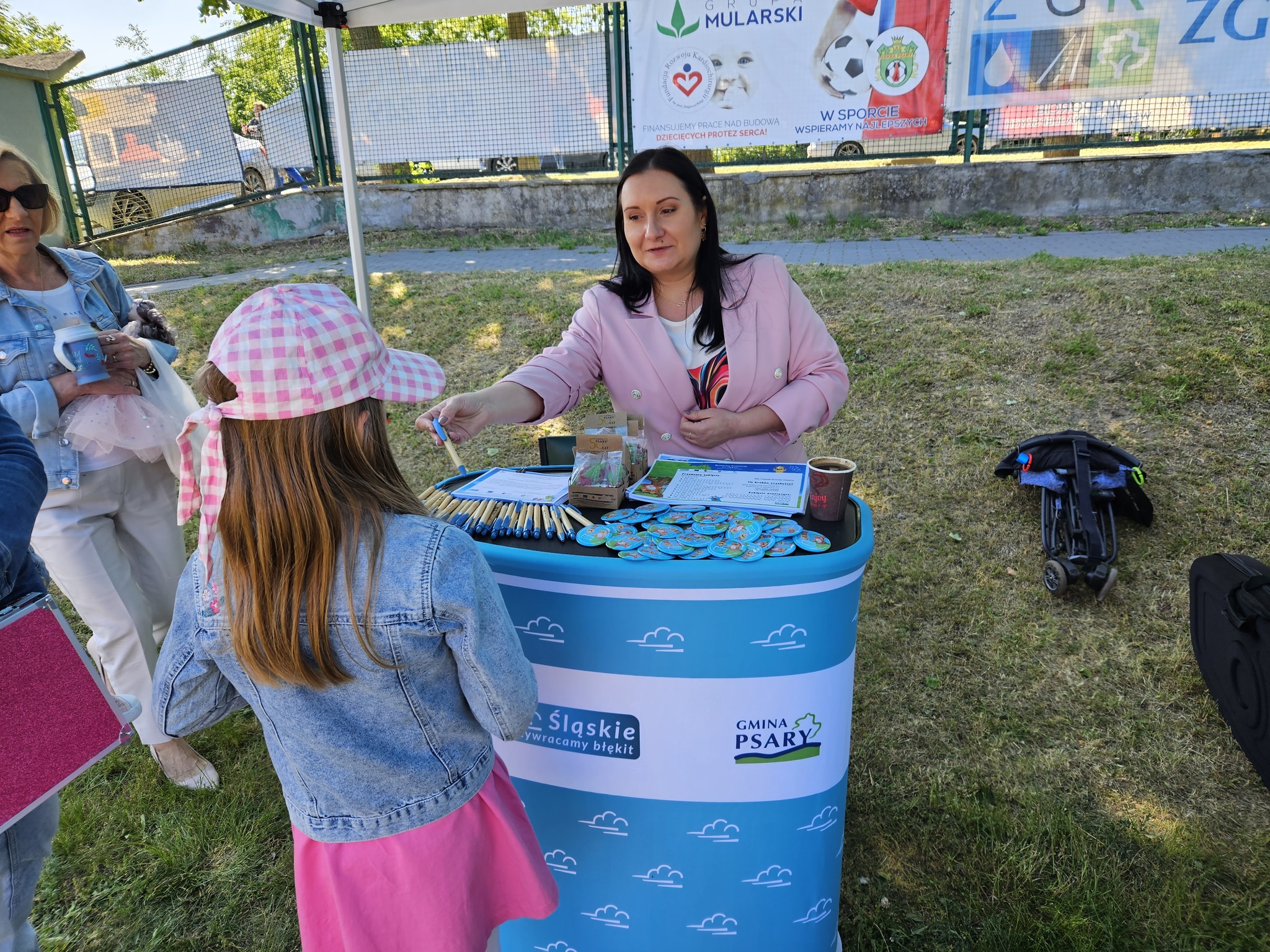 During the Municipal Children's Day in Psary, among numerous attractions for the youngest participants, a field game organized in the Żurawiniec Park garnered significant interest. Several dozen families took part in it. Each participant received a sweet reward and a commemorative pen from the eco-manager, along with a grateful title of "Guardian of the Blue Sky" button.