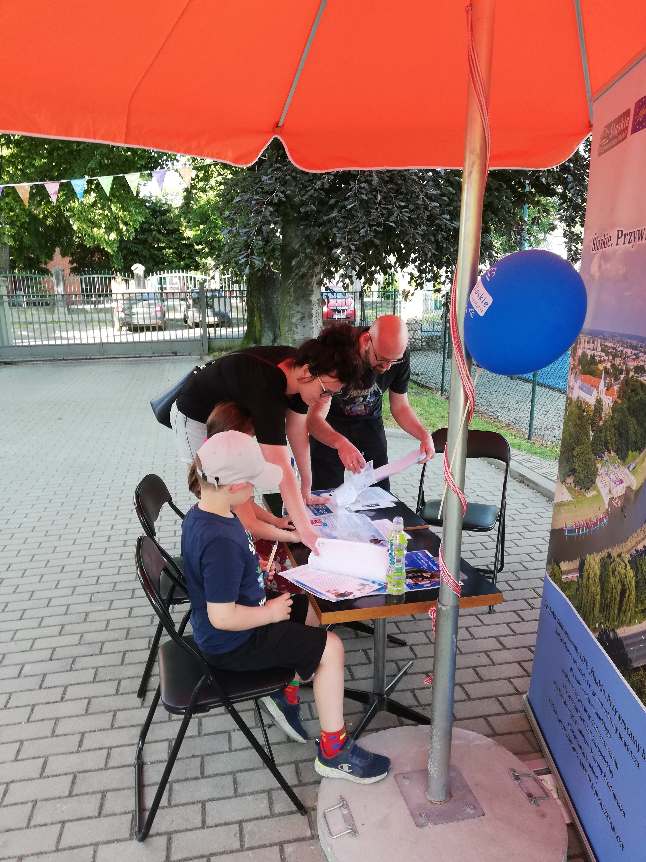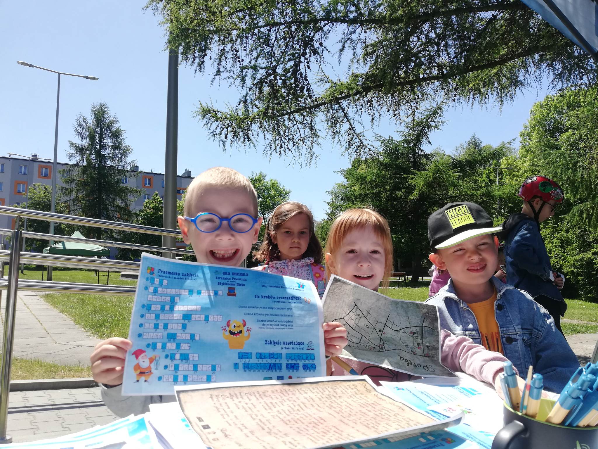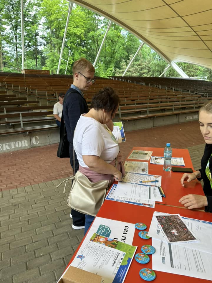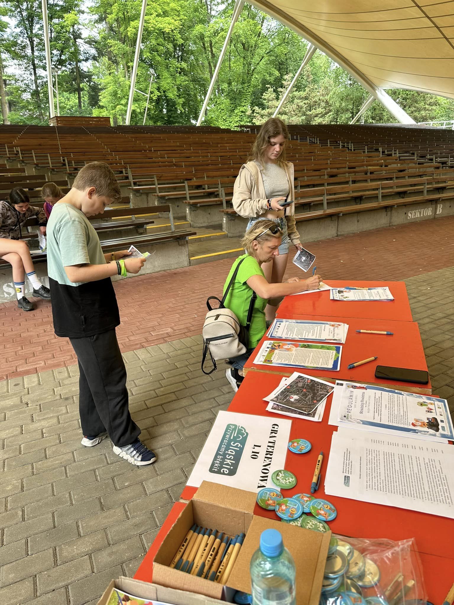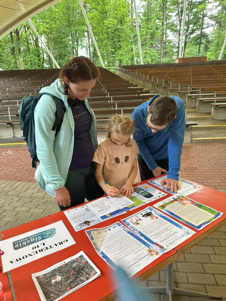 The starting and ending point of the game in Poręba was located near the building of the Municipal Cultural Center, where the finale of the "Eco Poręba" festival was taking place simultaneously. The game route was approximately 2 km long and led around characteristic locations in the city. It included the City Hall, the municipal stadium, the city park, and the nearby church. Many residents of Poręba participated in the event, mainly families with children, but the game also attracted interest from people of all age groups. The participants successfully completed the tasks presented to them, and upon finishing the game, they received gifts such as buttons, mugs, or board games.