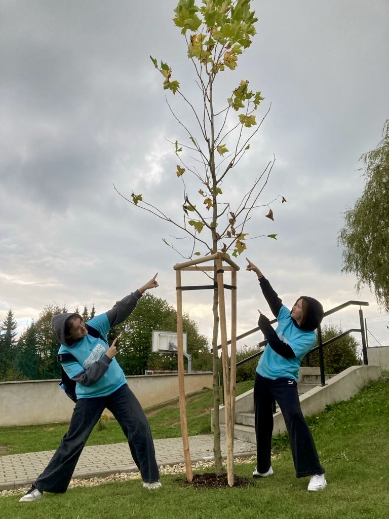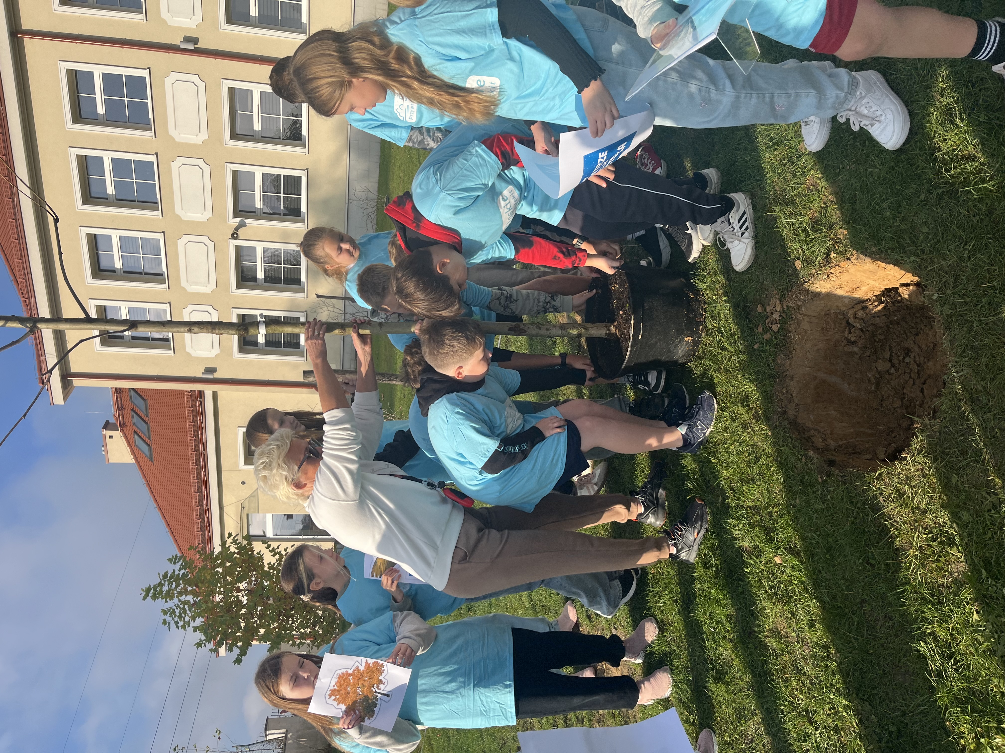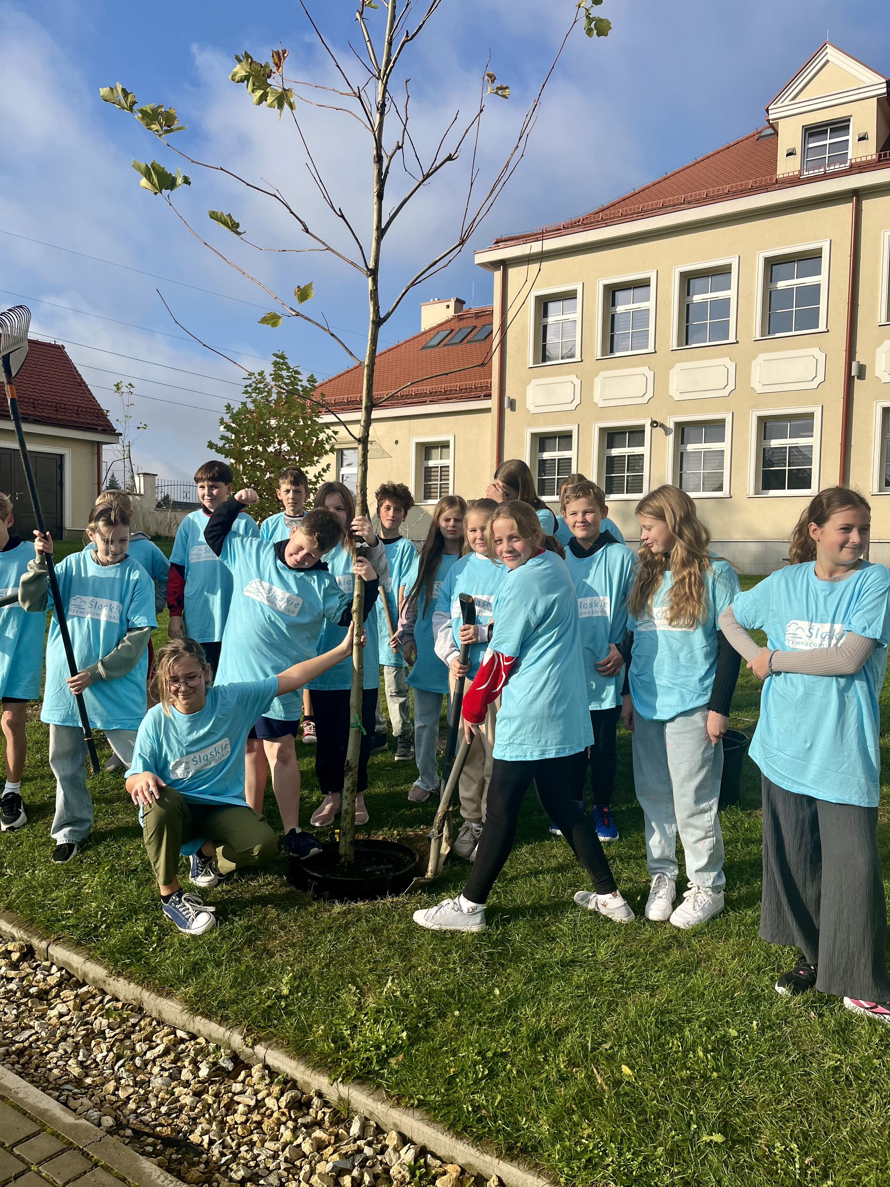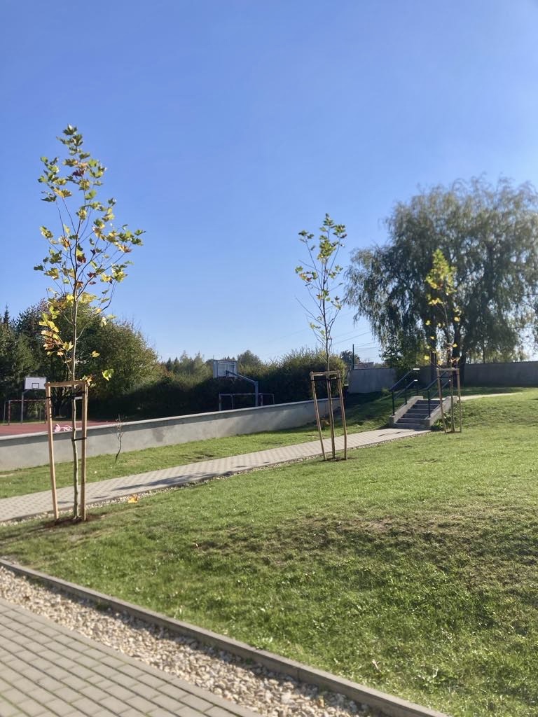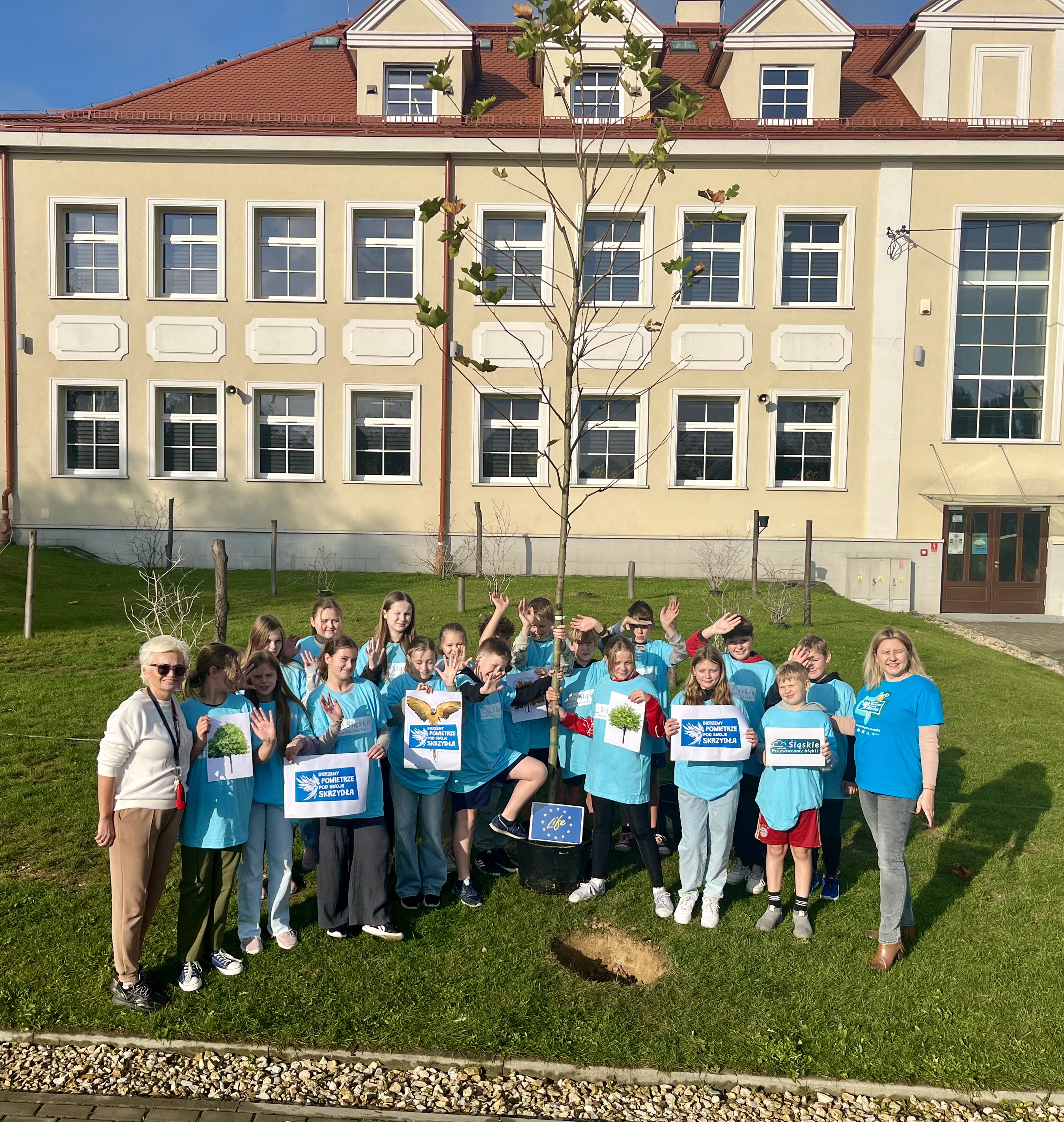The School's Anti-Smog Team, which operates as part of the LIFE program “Silesia. Blue Sky Restored,” along with the students, under the supervision of Edyta Garlińska, the eco-manager of Jastrzębie-Zdrój, planted six magnificent plane trees. Together with the students, the trees were also planted by the school principal, Beata Cisek.These trees will not only enhance the aesthetic of the school grounds but also contribute significantly to improving air quality, producing oxygen, and providing shade during hot days.