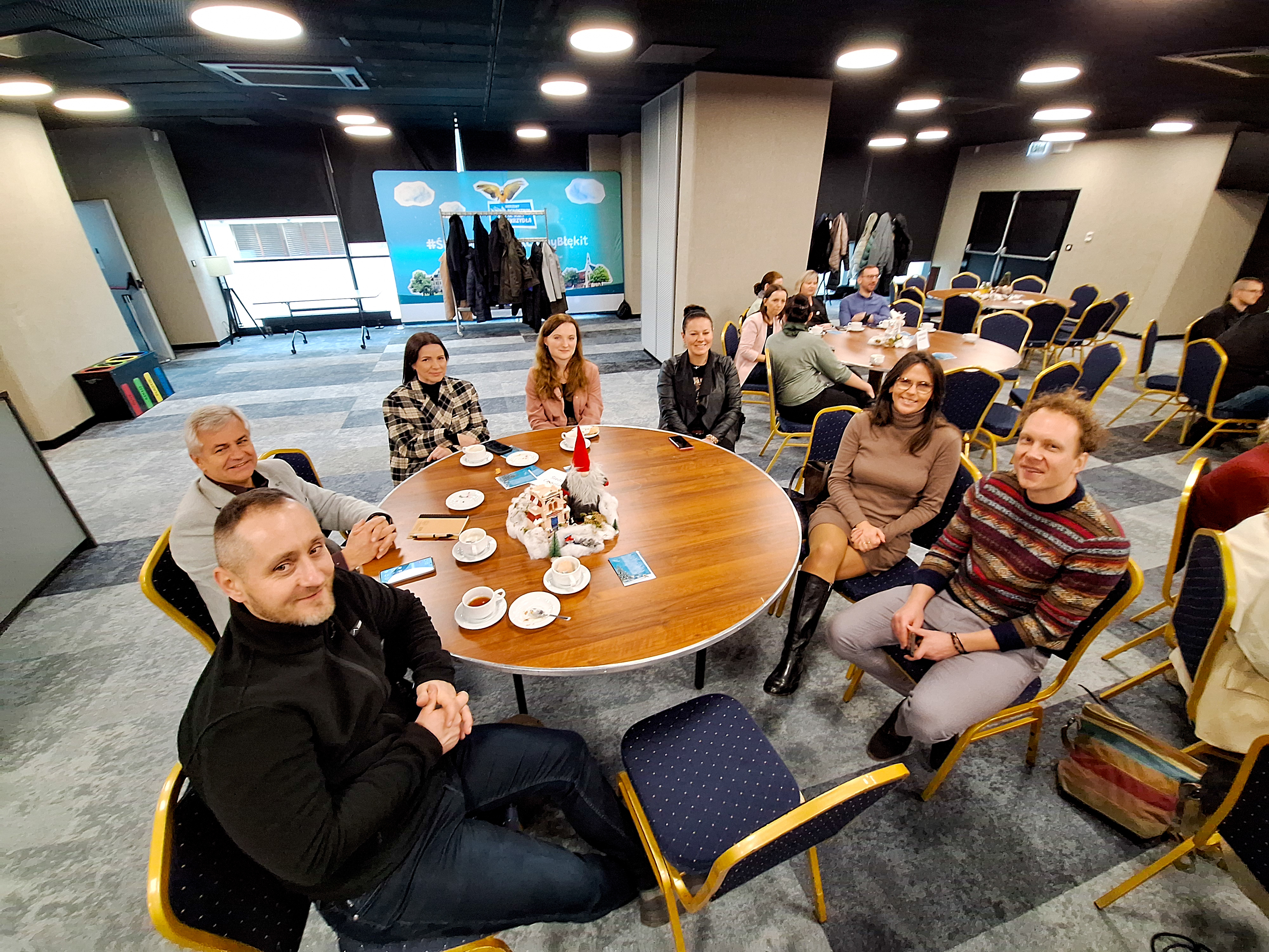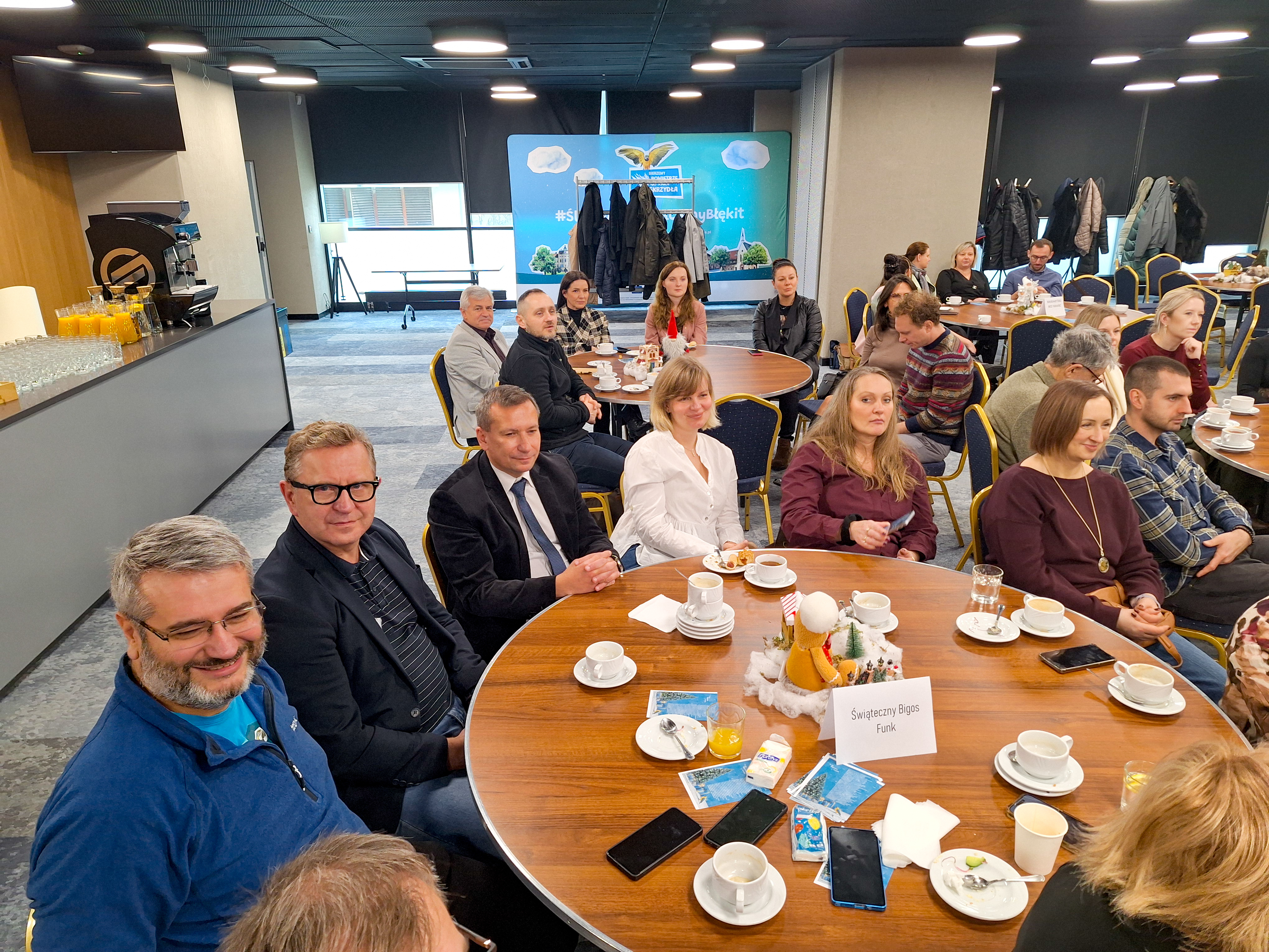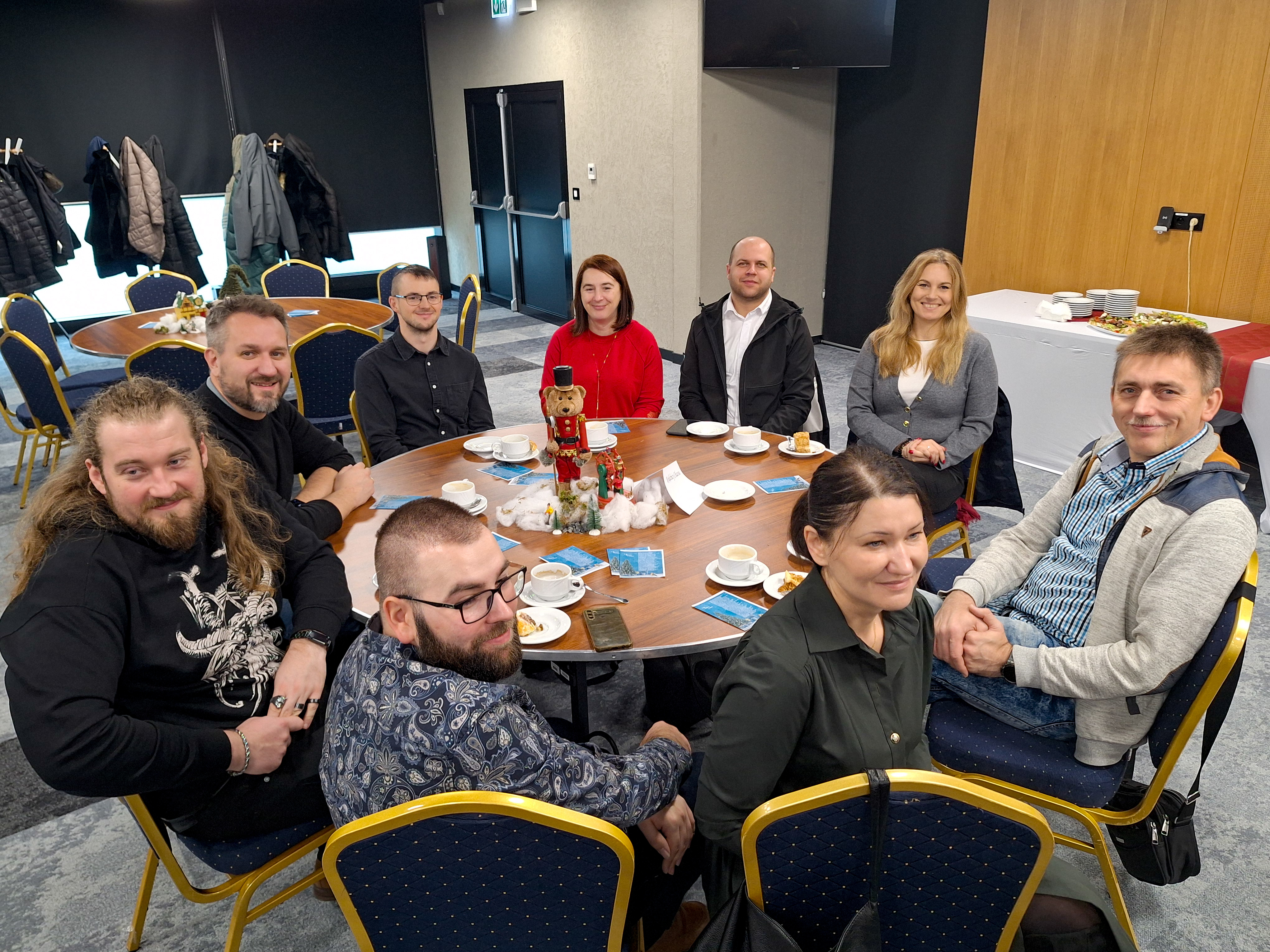 Po intensywnych rozmowach przyszła pora na bardziej swobodną część spotkania. Zabawy i konkursy o tematyce przedświątecznej wprowadziły lekkość i humor, integrując uczestników i tworząc przestrzeń do budowania relacji poza typowo projektowym kontekstem. Śmiech mieszał się z dźwiękiem świątecznych melodii, a w przerwach serwowano drobny poczęstunek, w tym aromatyczny czerwony barszcz wigilijny, który dopełnił atmosferę nadchodzących świąt.