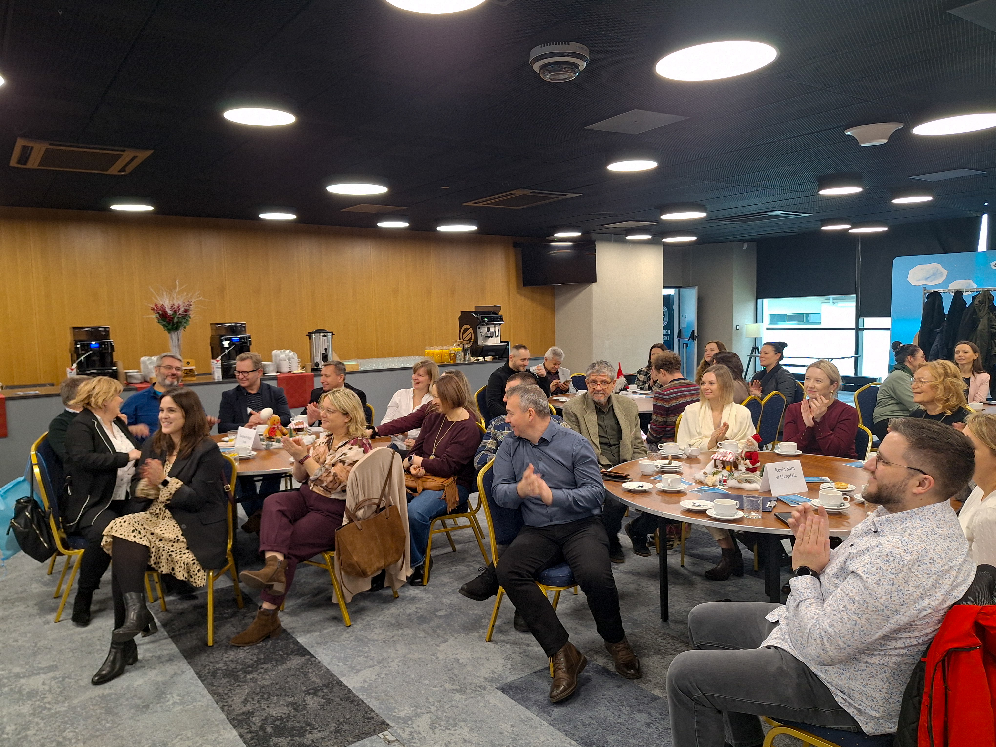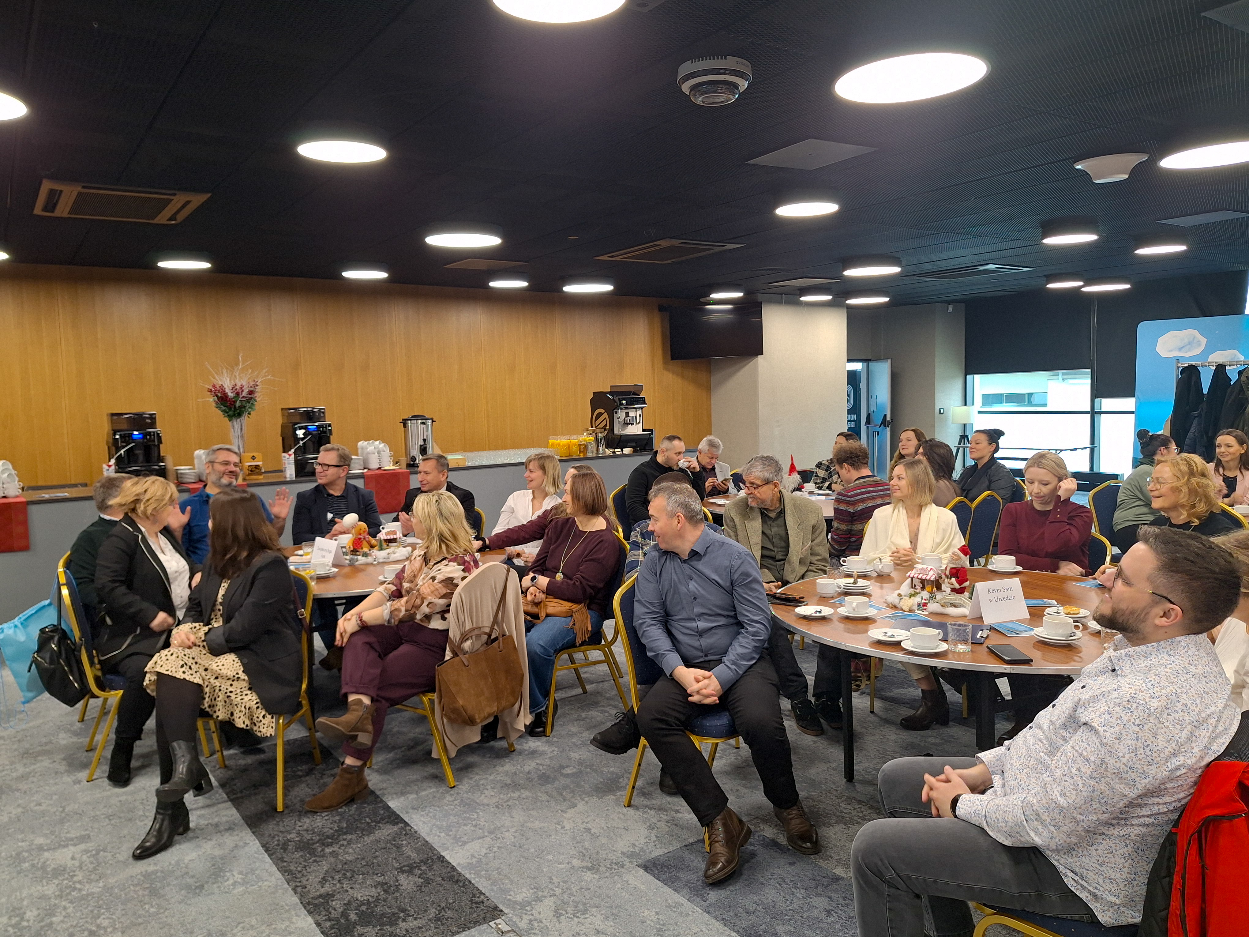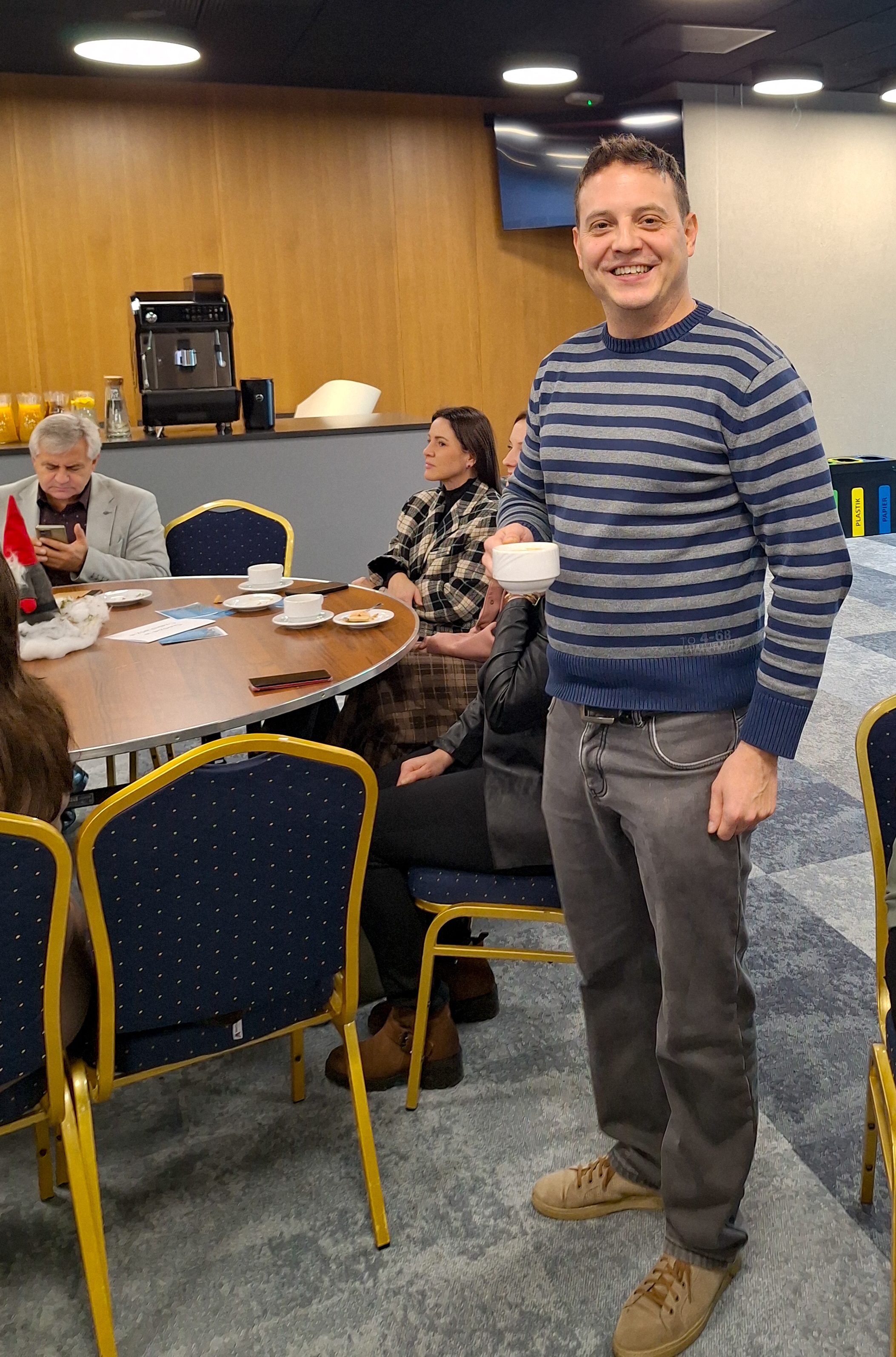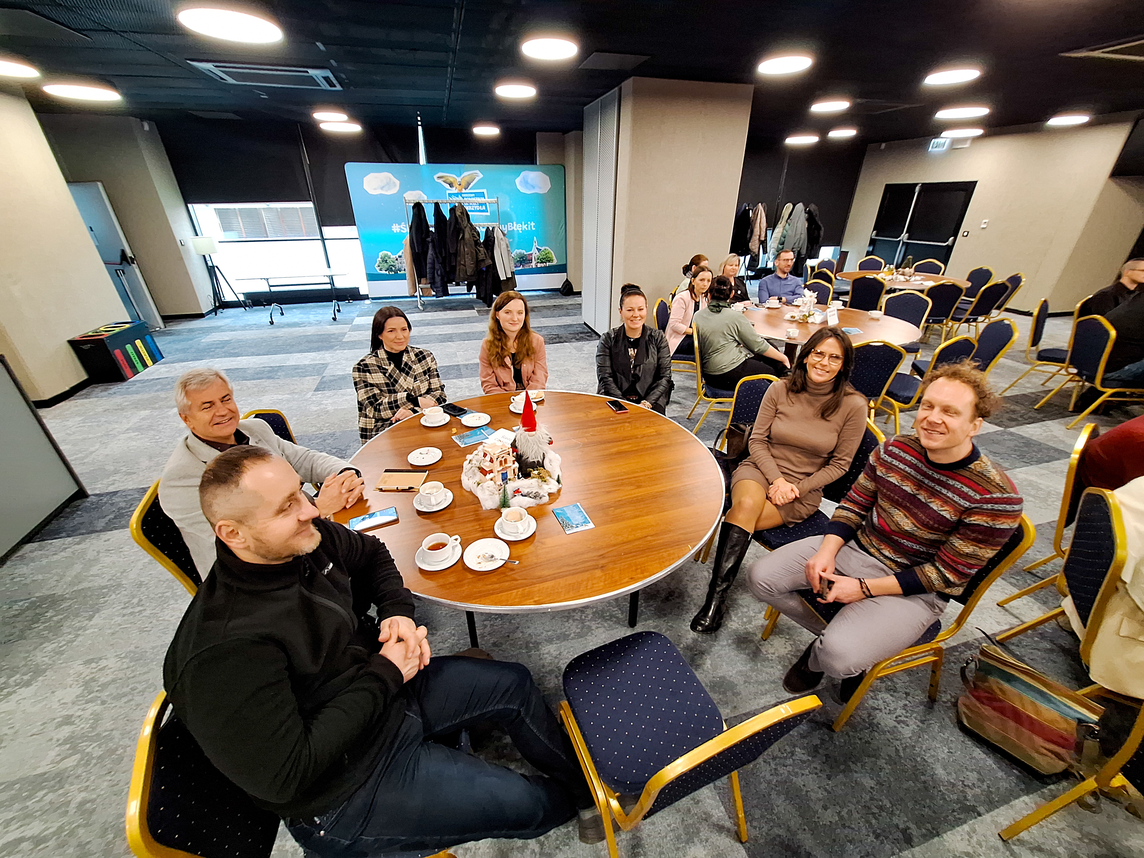 Po intensywnych rozmowach przyszła pora na bardziej swobodną część spotkania. Zabawy i konkursy o tematyce przedświątecznej wprowadziły lekkość i humor, integrując uczestników i tworząc przestrzeń do budowania relacji poza typowo projektowym kontekstem. Śmiech mieszał się z dźwiękiem świątecznych melodii, a w przerwach serwowano drobny poczęstunek, w tym aromatyczny czerwony barszcz wigilijny, który dopełnił atmosferę nadchodzących świąt.